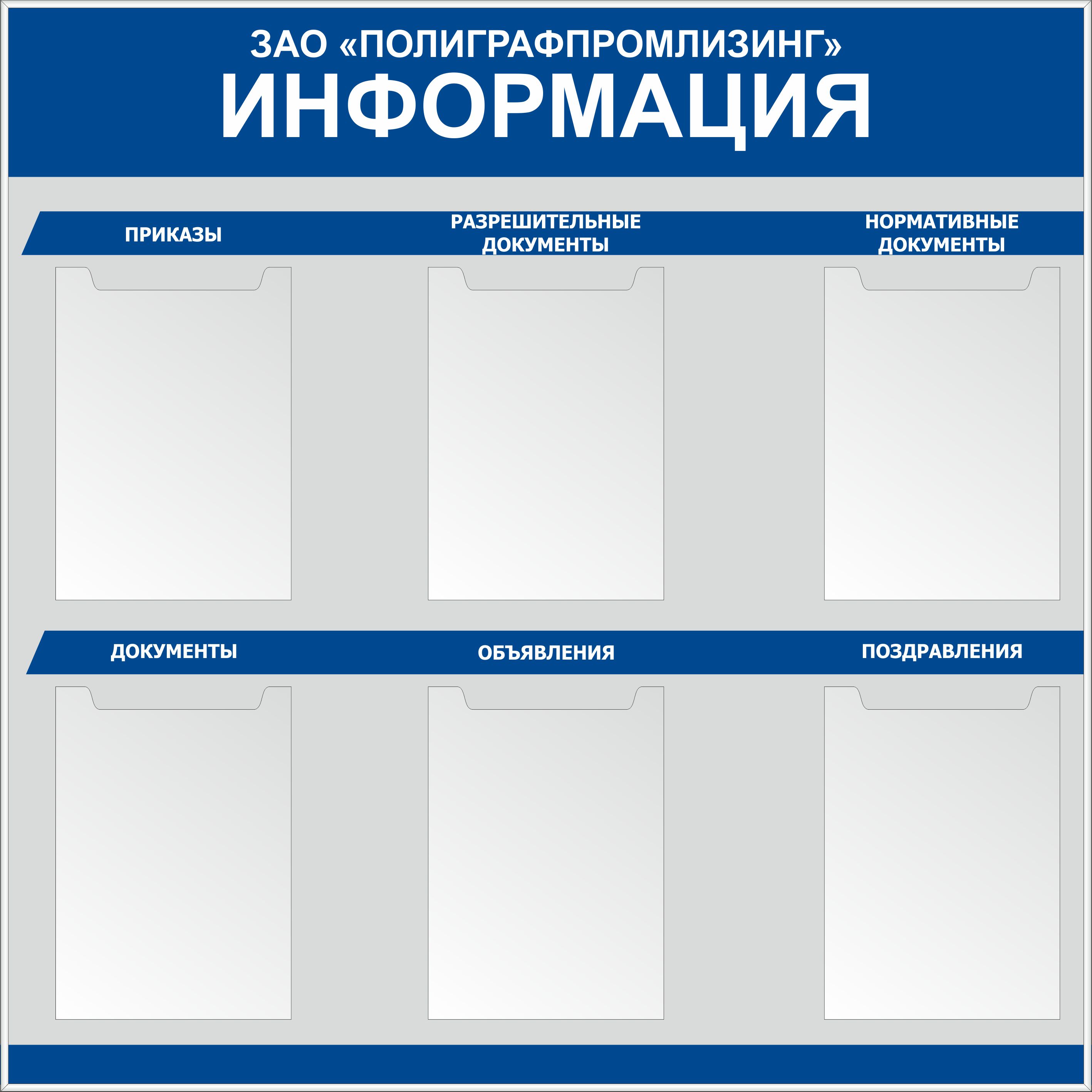 Информационный стенд, 4 плоских кармана А4, 1 плоский А1 профиль алюминевый (1600х850) (Пластик ПВХ 4 мм, алюминиевый профиль)